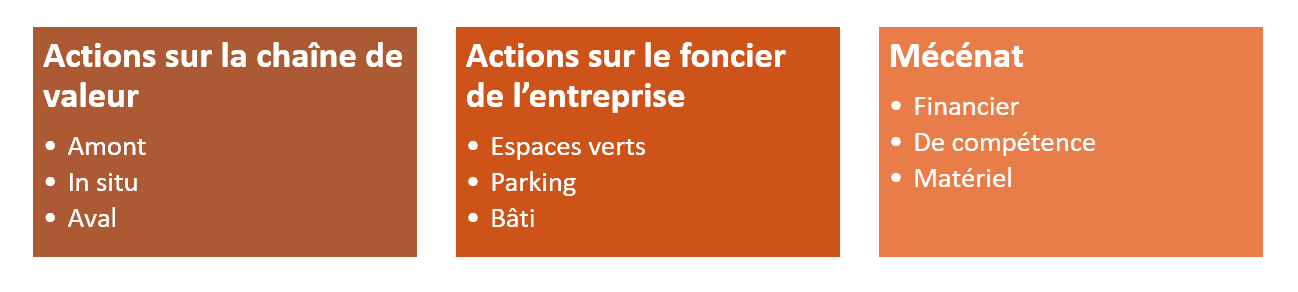 Après la réalisation d'un diagnostic de ses impacts et de ses dépendances, comme décrits dans le premier webinaire, trois types d'actions s'offrent aux entreprises qui souhaitent s'engager dans une démarche biodiversité, résumés dans le schéma ci-dessous :