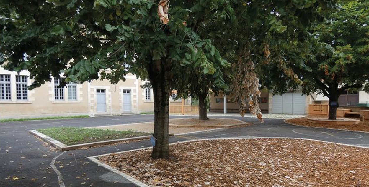 En 2023, la commune de Ruffec s'est fixée l'ambition de renforcer la résilience de leur cour d'école sur 2 plans : l'amélioration des conditions thermiques et une meilleure gestion des eaux de pluie. Pour se faire, elle a désimperméabilisé une grande partie de la cour, multiplié les zones de végétation et travaillé sur la déconnexion des gouttières.