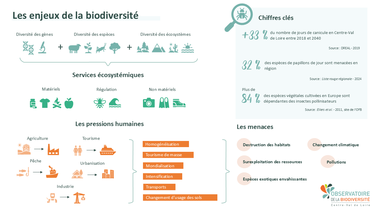 La biodiversité désigne à la fois les milieux naturels (forêts, prairies, landes, rivières...), les espèces animales et végétales mais aussi la diversité qui existe entre individus. On désigne par là (la diversité génétique), qui amène par exemple plusieurs phénotypes au sein d'une même espèce. Milieux, espèces, individus, sont liés par des interactions : alimentation, prédation, reproduction, habitat. C'est la richesse de la biodiversité qui assure une fonctionnalité des écosystèmes et permet d'assurer des services dits écosystémiques (services matériels, de régulation, non matériels). Nous autres homo sapiens, utilisons ces services écosystémiques pour nos activités et nos sociétés : agriculture, habitat, pêche, tourisme, industrie.