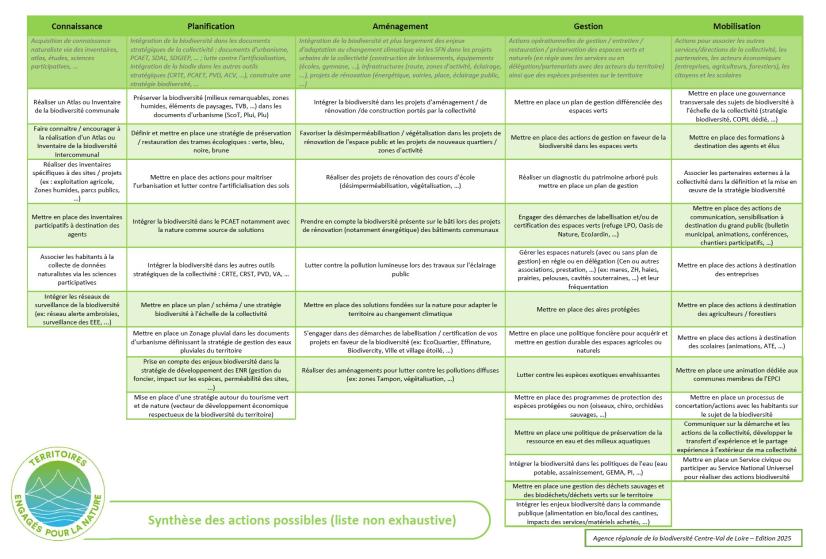 Les collectivités reconnues s'engagent en faveur de la biodiversité au travers la formalisation d'un plan d'action à 3 ans. Pour répondre à des enjeux communs, ces actions sont parfois similaires d'une collectivité à l'autre, telles que :