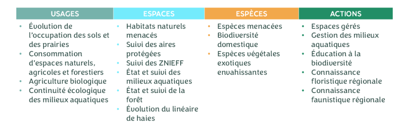 Les indicateurs sont classés en 4 catégories : usages, espaces, espèces et actions.