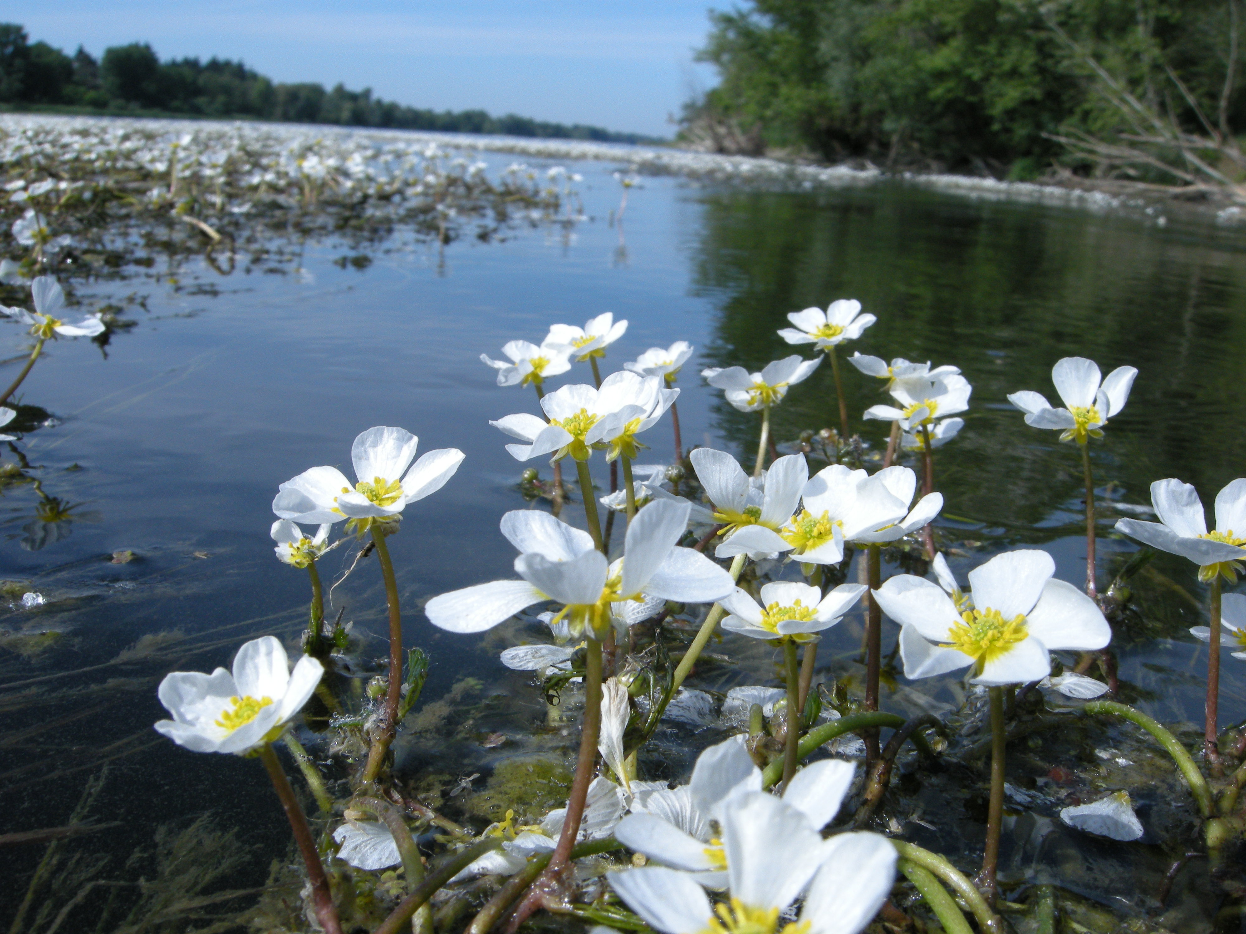 La renoncule en pinceau (Ranunculus penicillatus) pousse naturellement dans les rivières. Entièrement submergée, seules les fleurs sont émergées. Cela leur est bien utile pour être pollinisées par des insectes volants.